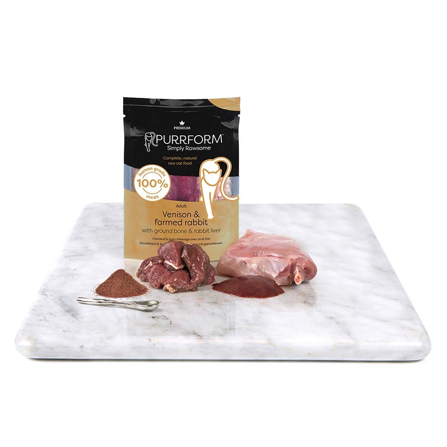 Purrform Venison & Farmed Rabbit meat and Ground Bone with Rabbit Liver is a complete natural pet food for adult cats that contains nothing more than the ingredients listed.